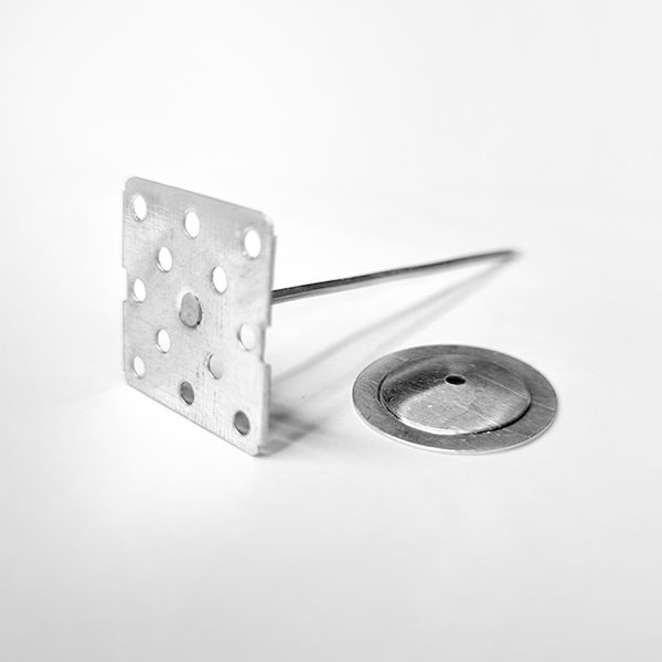 Spindle Pins are used to fix and install lower density insulation material that can be pierced by metal spindles. The metal base is available with a perforated base to be bonded with suitable adhesive. A washer is applied over the protruding spindle to retain the insulation material.